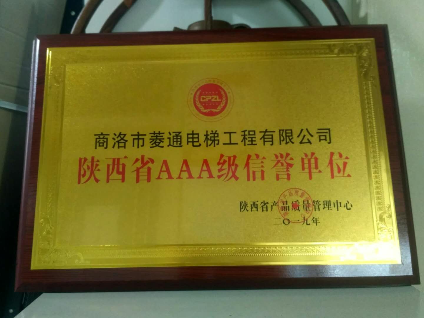 商洛菱通電梯工程有限公司,2019年很榮幸被陜西省產(chǎn)品質(zhì)量管理中心評為:陜西省AAA級信譽(yù)單位和陜西省重質(zhì)量守信譽(yù)先進(jìn)單位;并頒發(fā)獎牌及榮譽(yù)證書。這個榮譽(yù)不但得益于各單位的支持與默契合作,更得益于我公司優(yōu)良的團(tuán)隊(duì)氛圍和集體上下一致積極認(rèn)真的工作態(tài)度。更得益于領(lǐng)導(dǎo)重承諾守信譽(yù):提倡安全第一,質(zhì)量第一,信譽(yù)第一的原則。能被評為3A級信譽(yù)單位和信譽(yù)先進(jìn)單位,既是對公司工作的肯定,也是對今后工作做得更好的一種鼓勵,我公司定會盡職盡責(zé)做得更好。
